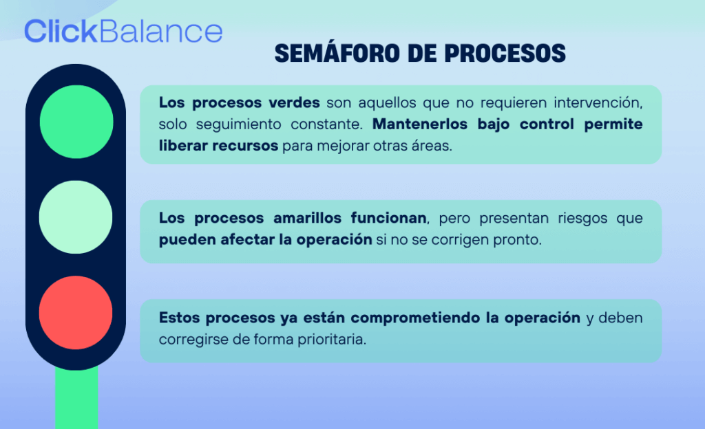 El control de procesos mediante el semáforo te permite tomar decisiones oportunas y estratégicas, evitando que pequeños errores se conviertan en problemas críticos.